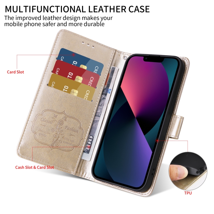 Funda de Cuero iPhone 16 Diseño Mariposas y Flores En Relieve (Dorada)