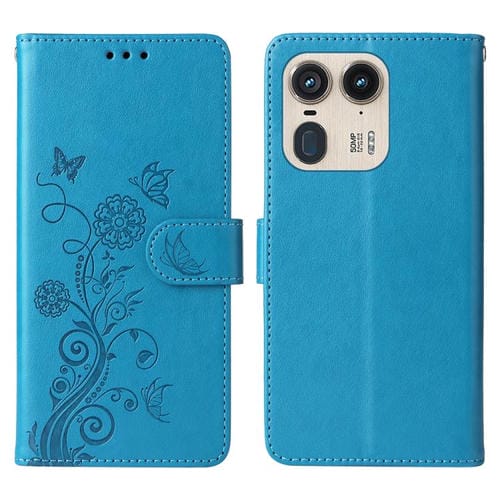 Funda de Cuero Motorola Edge 50 Ultra/X50 Ultra con Diseño de Mariposas y Flores en Relieve (Azul)