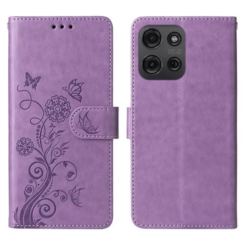 Funda de Cuero Motorola Moto G75 5G con Diseño de Mariposas y Flores en Relieve (Morado)