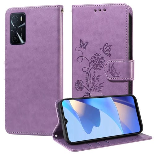 Funda de Cuero con Diseño de Mariposas y Flores En Relieve para Oppo A54 4G/A54S/A55 4G/5G/A53S 5G (Morado)