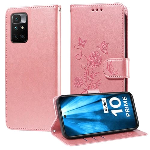 Funda de Cuero con Diseño de Mariposas y Flores En Relieve para Redmi 10 2022/10 Prime (Oro Rosa)