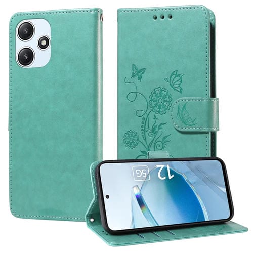 Funda de Cuero con Diseño de Mariposas y Flores En Relieve para Redmi 12 5G/4G/Note 12R (Verde)