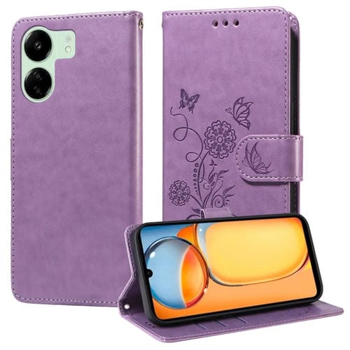 Funda de Cuero con Diseño de Mariposas y Flores En Relieve para Redmi 13C 5G/4G/13R (Morado)