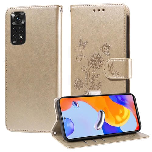 Funda de Cuero con Diseño de Mariposas y Flores En Relieve para Redmi Note 11 4G/Note 11S (Dorada)