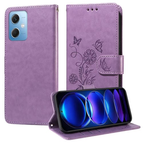Funda de Cuero con Diseño de Mariposas y Flores En Relieve para Redmi Note 12 5G (Morado)