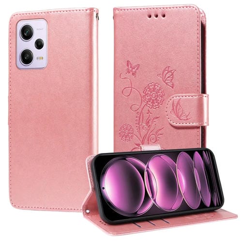 Funda de Cuero con Diseño de Mariposas y Flores En Relieve para Redmi Note 12 Pro 5G (Oro Rosa)
