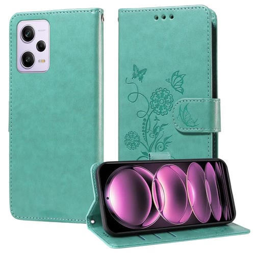 Funda de Cuero con Diseño de Mariposas y Flores En Relieve para Redmi Note 12 Pro 5G (Verde)