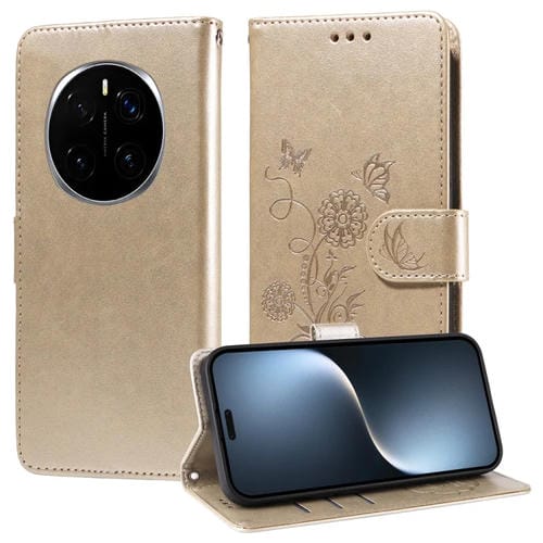 Funda de Cuero Honor Magic7 Pro con Diseño de Mariposas y Flores en Relieve (Dorada)