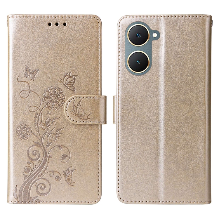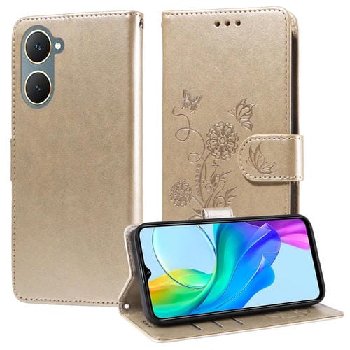 Funda de Cuero con Diseño de Mariposas y Flores En Relieve para Vivo Y03 4G / Y18 / Y28S 5G (Dorada)