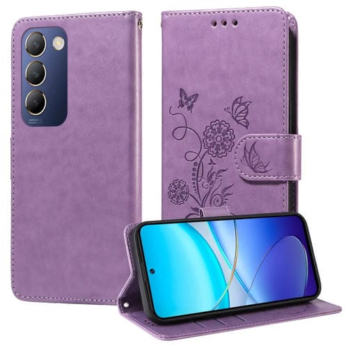 Funda de Cuero con Diseño de Mariposas y Flores En Relieve para Vivo Y100 Idn / Y200E 5G (Morado)