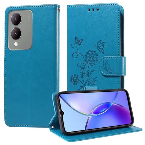 Funda de Cuero con Diseño de Mariposas y Flores En Relieve para Vivo Y17S / Y36I 5G / Y28 5G (Azul)