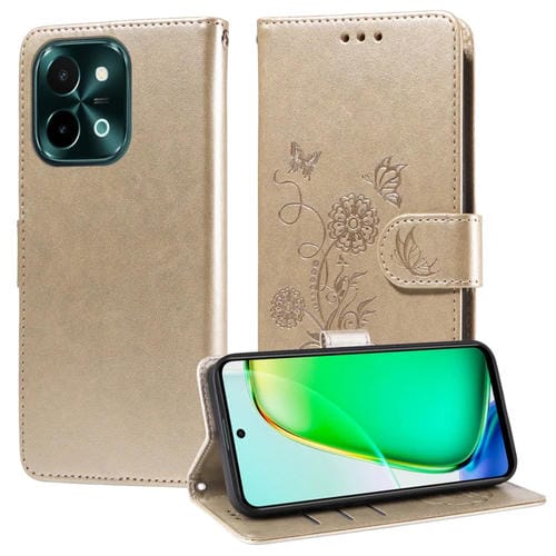 Funda de Cuero con Diseño de Mariposas y Flores En Relieve para Vivo Y28 4G (Dorada)