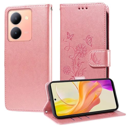 Funda de Cuero con Diseño de Mariposas y Flores En Relieve para Vivo Y36 4G/5G (Oro Rosa)