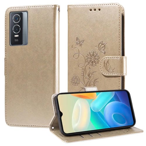 Funda de Cuero con Diseño de Mariposas y Flores En Relieve para Vivo Y76 5G/Y76S (Dorada)