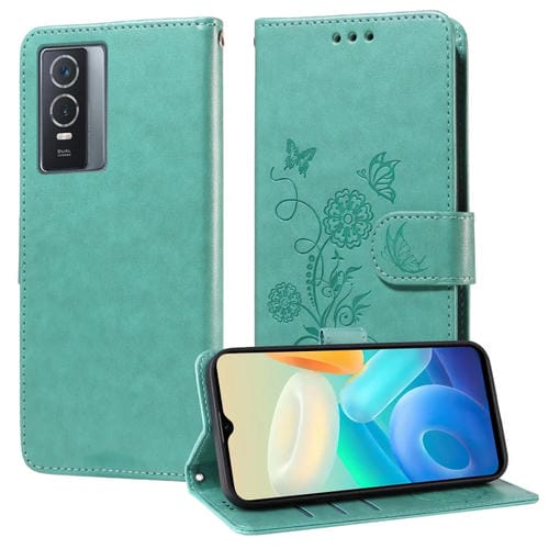 Funda de Cuero con Diseño de Mariposas y Flores En Relieve para Vivo Y76 5G/Y76S (Verde)