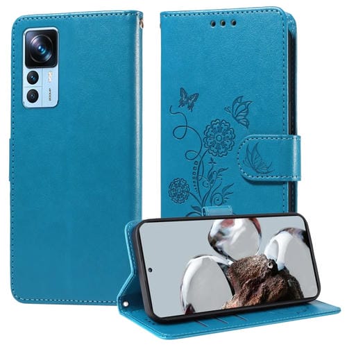 Funda de Cuero con Diseño de Mariposas y Flores En Relieve para Xiaomi 12T / 12T Pro / Redmi K50 Ultra (Azul)