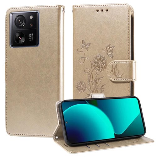 Funda de Cuero con Diseño de Mariposas y Flores En Relieve para Xiaomi 13T/13T Pro/Redmi K60 Ultra (Dorada)
