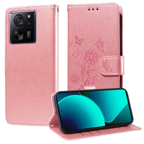 Funda de Cuero con Diseño de Mariposas y Flores En Relieve para Xiaomi 13T/13T Pro/Redmi K60 Ultra (Oro Rosa)