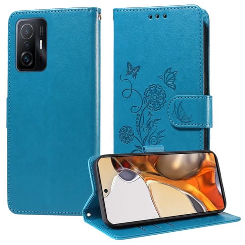 Funda de Cuero con Diseño de Mariposas y Flores En Relieve para Xiaomi Mi 11T/11T Pro (Azul)