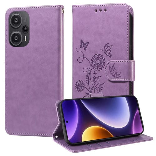 Funda de Cuero con Diseño de Mariposas y Flores En Relieve para Xiaomi Poco F5/Redmi Note 12 Turbo (Morado)