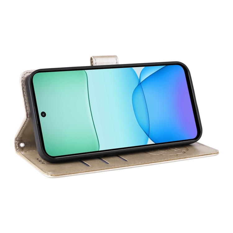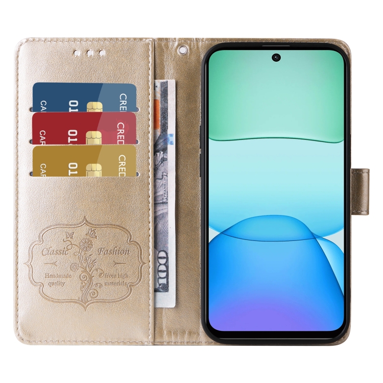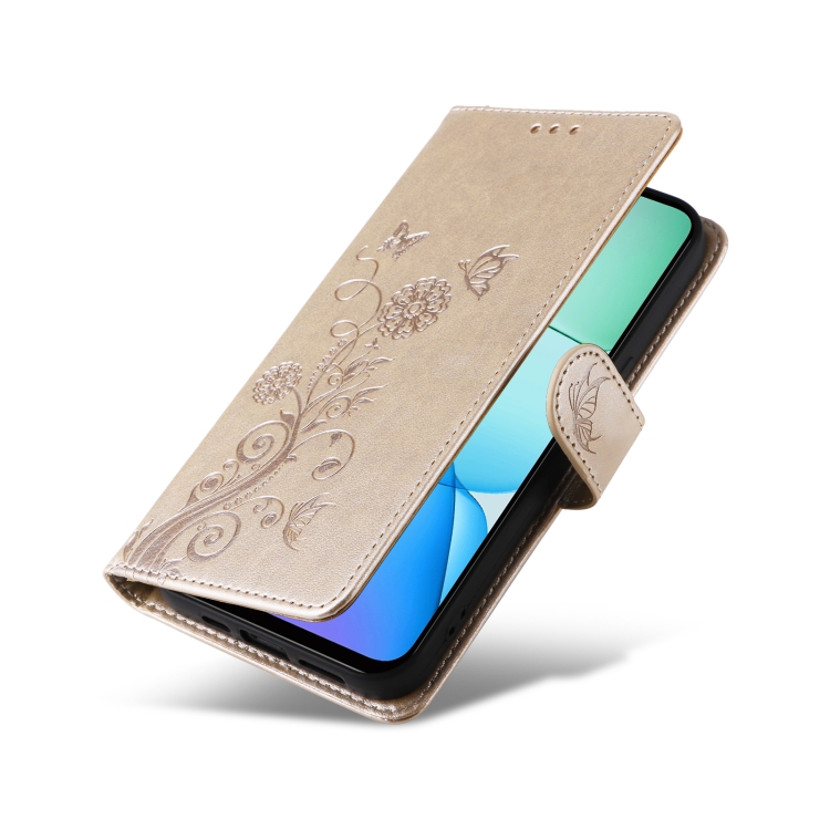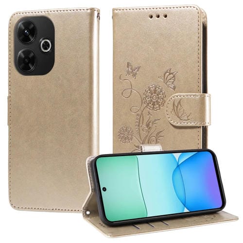 Funda de Cuero con Diseño de Mariposas y Flores En Relieve para Xiaomi Poco M6 4G (Dorada)