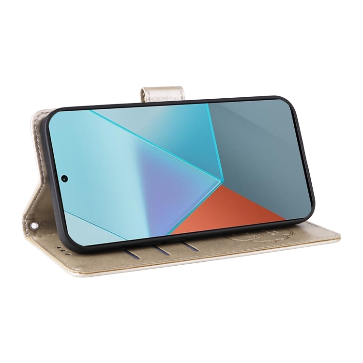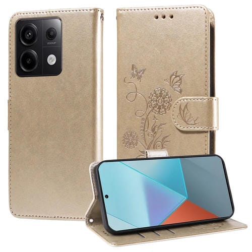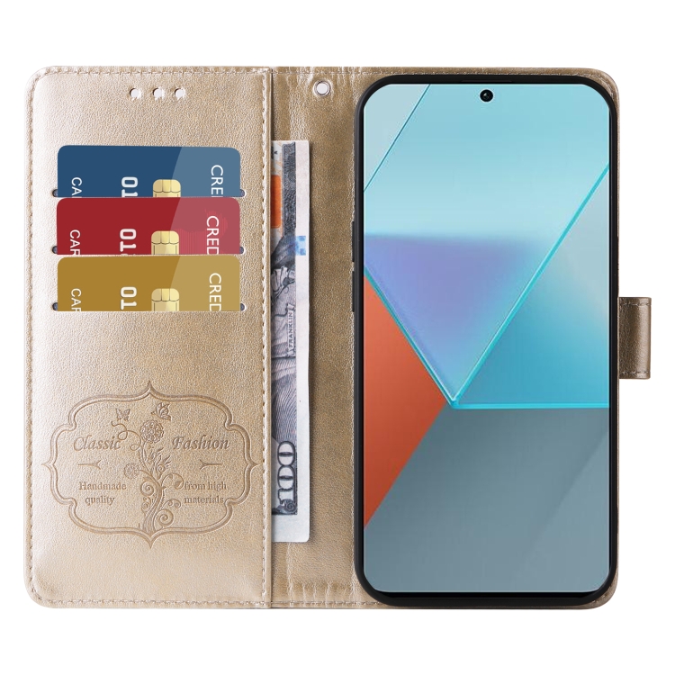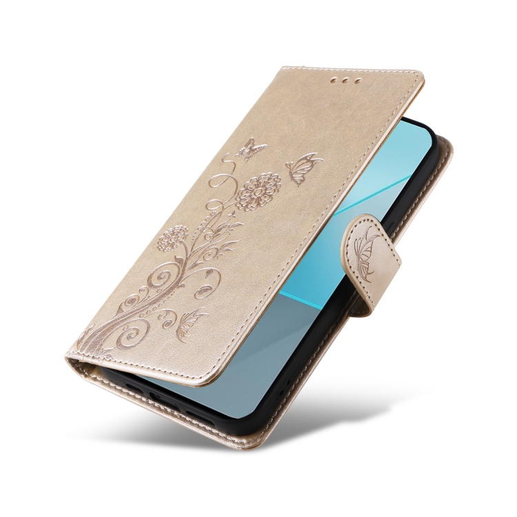 Funda de Cuero con Diseño de Mariposas y Flores En Relieve para Xiaomi Poco X6 5G (Dorada)