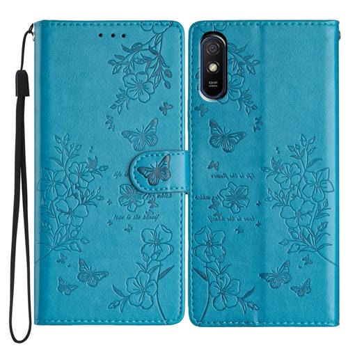 Funda de Cuero con Diseño de Mariposas y Flores para Redmi 9A (Azul)