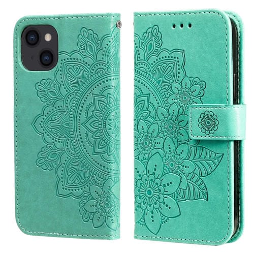Funda de Cuero con Estampado de Flores de 7 Pétalos para iPhone 14 (Verde)