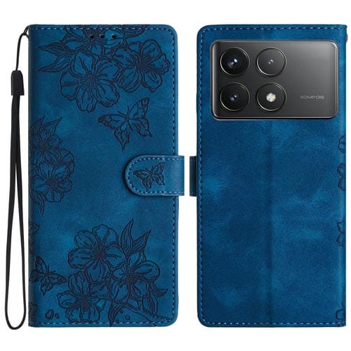 Funda de Cuero con Estampado de Flores y Mariposas para Xiaomi Poco F6 Pro (Azul)