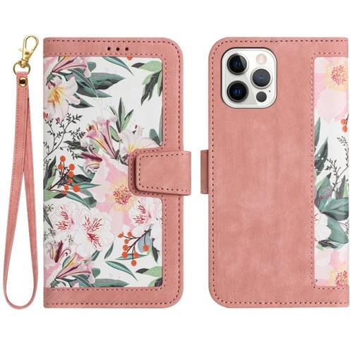 Funda de Cuero para iPhone 12 Pro Max con Estampado Floral y Cordón (Rosa)