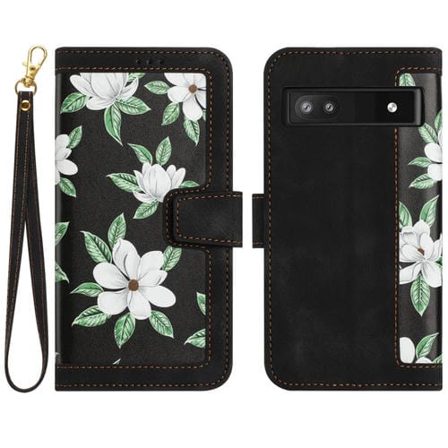 Funda de Cuero para Google Pixel 7A con Estampado Floral y Cordón (Negro)