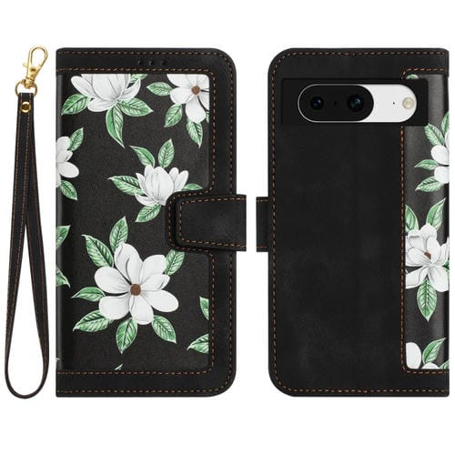 Funda de Cuero con Estampado Floral para Google Pixel 8 con Cordón (Negro)