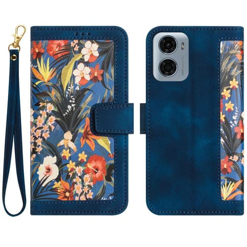 Funda de Cuero para Motorola Moto G05 con Estampado Floral y Cordón (Azul Oscuro)