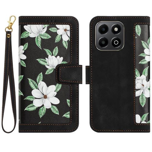 Funda de Cuero Honor 200 con Estampado Floral y Cordón para Teléfono (Negro)
