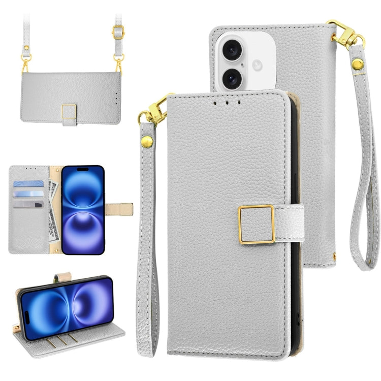 Funda de Cuero para iPhone 16 con Hebilla Cuadrada y Textura de Lichi Cruzada (Plateada)