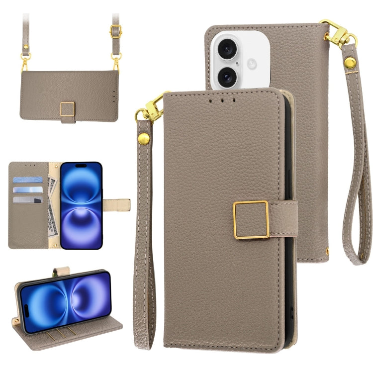Funda de Cuero para iPhone 16 con Hebilla Cuadrada y Textura de Lichi (Marrón)