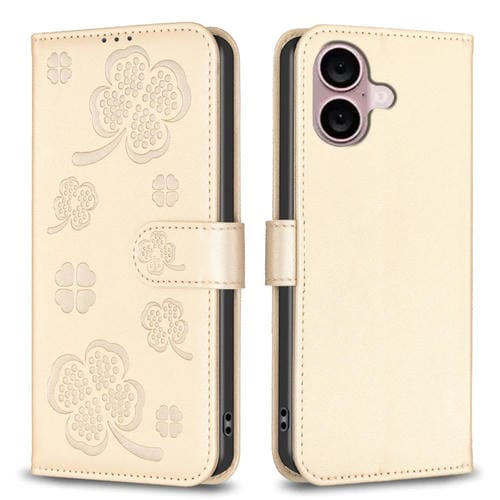 Funda de Cuero con Relieve de Cuatro Hojas para iPhone 16 Plus (Dorada)