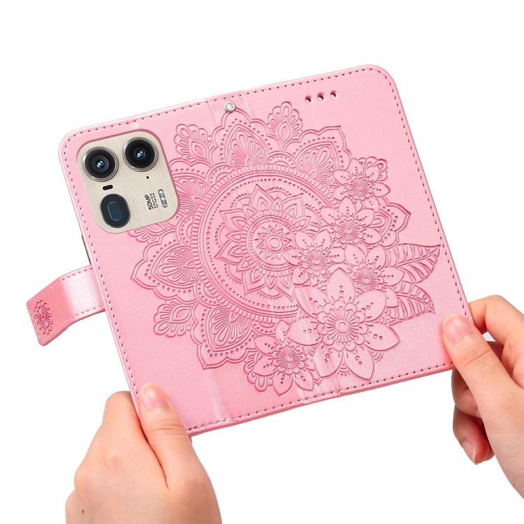 Funda de Cuero con Relieve de Flores de Siete Pétalos para Motorola Edge 50 Ultra/X50 Ultra (Oro Rosa)