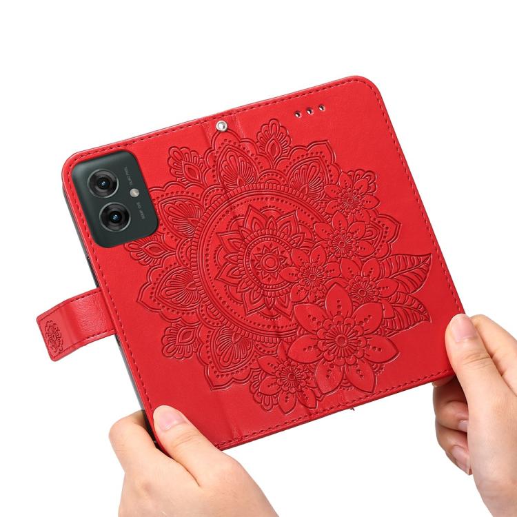 Funda de Cuero con Relieve de Flores de Siete Pétalos para Motorola Moto G55 (Rojo)