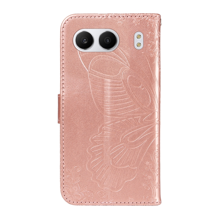 Funda de Cuero con Relieve Mariposa en Forma Cola de Golondrina para OnePlus Nord 4 5G (Oro Rosa)