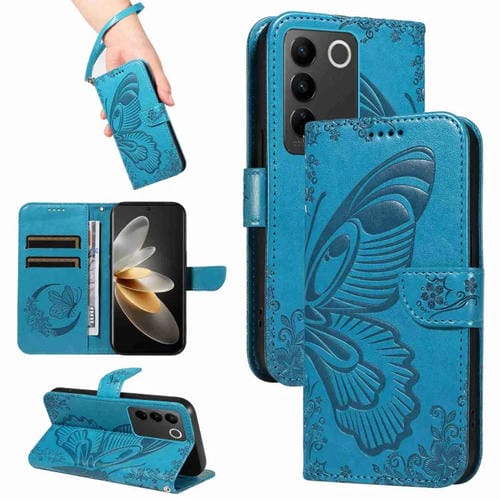 Funda de Cuero con Relieve de Mariposa En Forma de Cola de Golondrina para Vivo V27 5G/V27 Pro 5G (Azul)