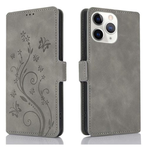 Funda de Cuero iPhone 11 Pro Max Relieve Mariposa y Flor Amor Ensueño (Gris)