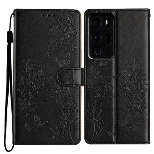 Funda de Cuero con Relieve Mariposa y Flor para Huawei P40 Pro (Negra)