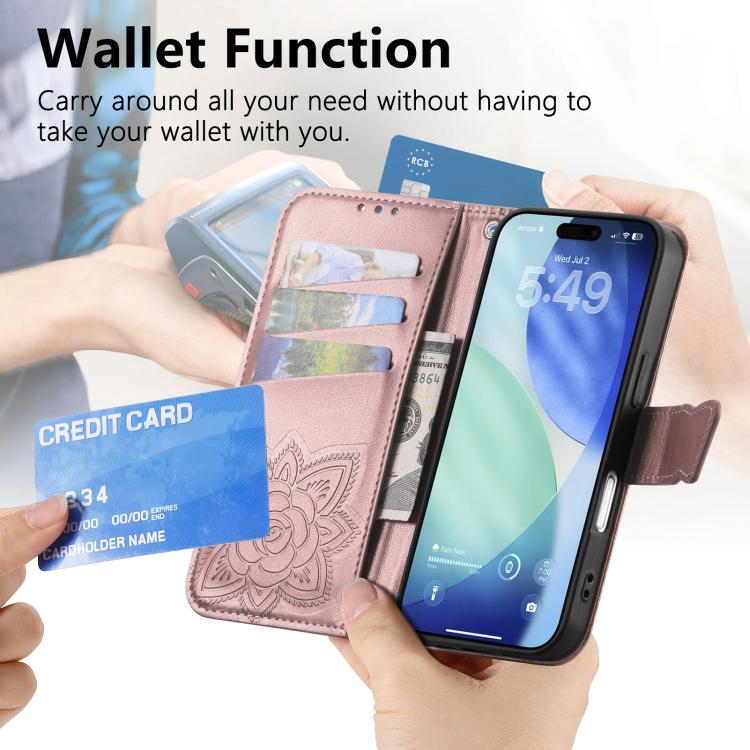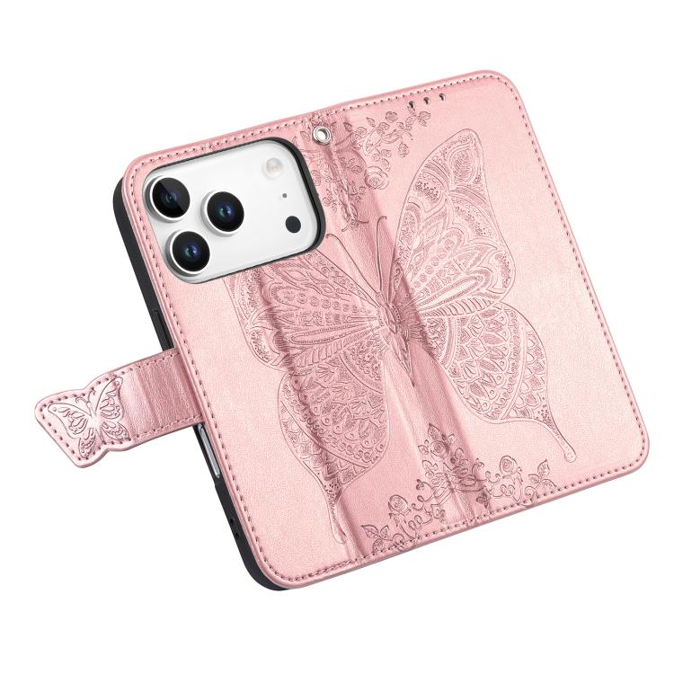 Funda de cuero con relieve de mariposa y flor para iPhone 17 Pro Max (oro rosa)
