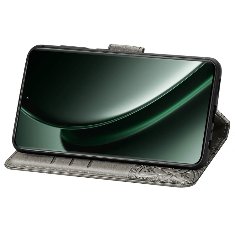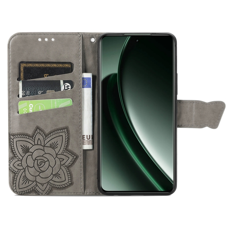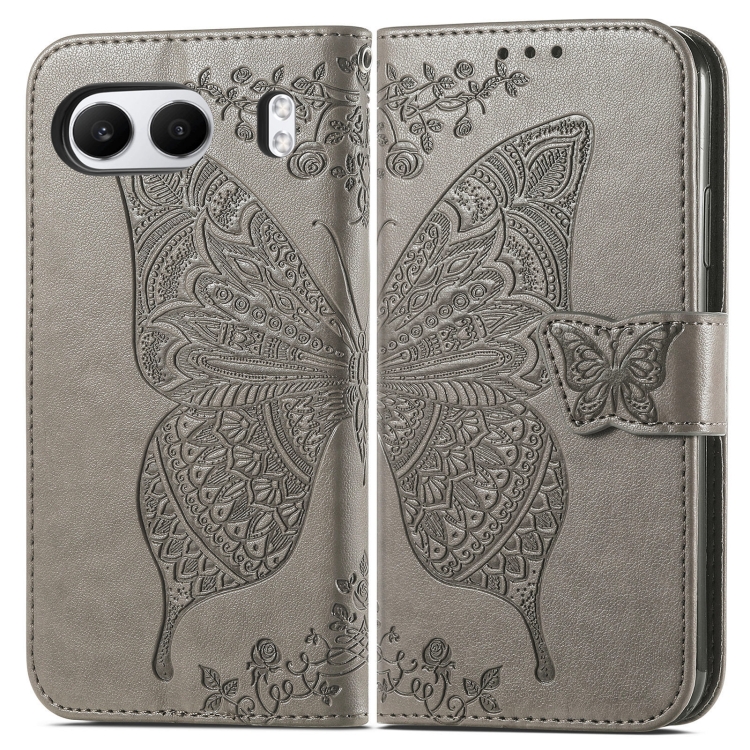 Funda de Cuero con Relieve Mariposa y Flor para OnePlus Nord 4 (Gris)