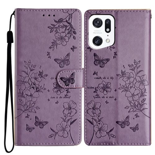 Funda de Cuero con Relieve de Mariposa y Flor para Oppo Find X5 Pro (Morado)