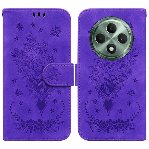 Funda de Cuero con Relieve de Mariposa y Rosa para Oppo Reno12 F 5G (Morado)