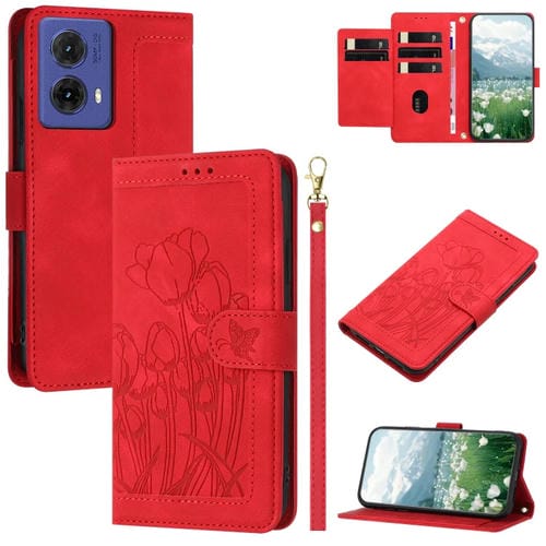 Funda de Cuero con Relieve de Tulipanes para Motorola Moto G85 con Cordón (Rojo)