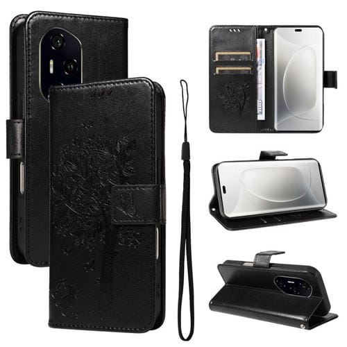 Funda de Cuero con Tapa para Honor 300 Pro/300 Ultra con Diseño Árbol y Gato (Negra)