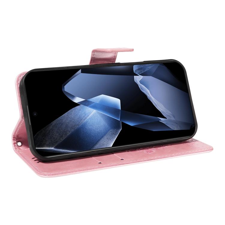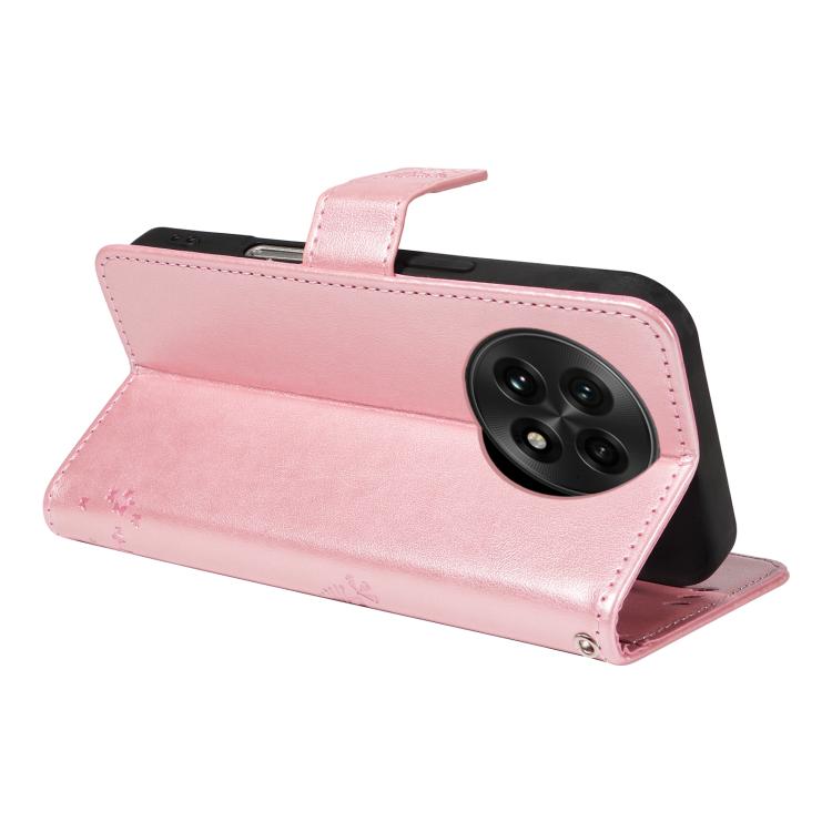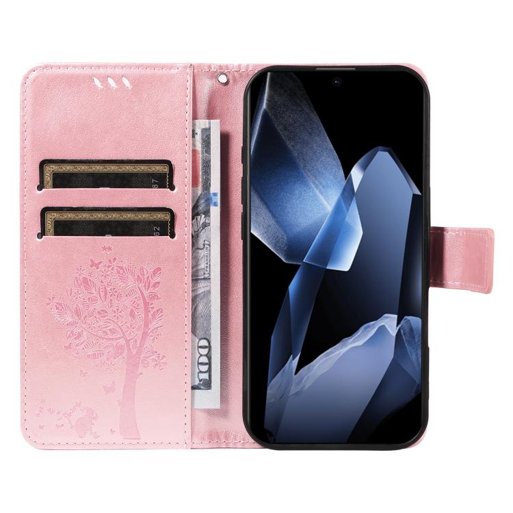 Funda de Cuero con Tapa para OnePlus 13 con Diseño de Árbol y Gato en Relieve (Oro Rosa)